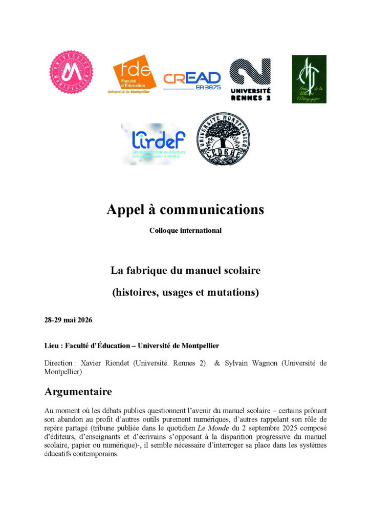 • Appel à communication – Colloque international sur le manuel scolaire – 28-29 mai 2026