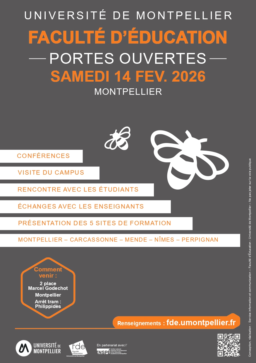 La Faculté d’Éducation de l’Université de Montpellier vous ouvre ses portes le samedi 14 février 2026 pour une journée entièrement dédiée à la découverte de nos formations, de nos campus et de nos équipes pédagogiques.
